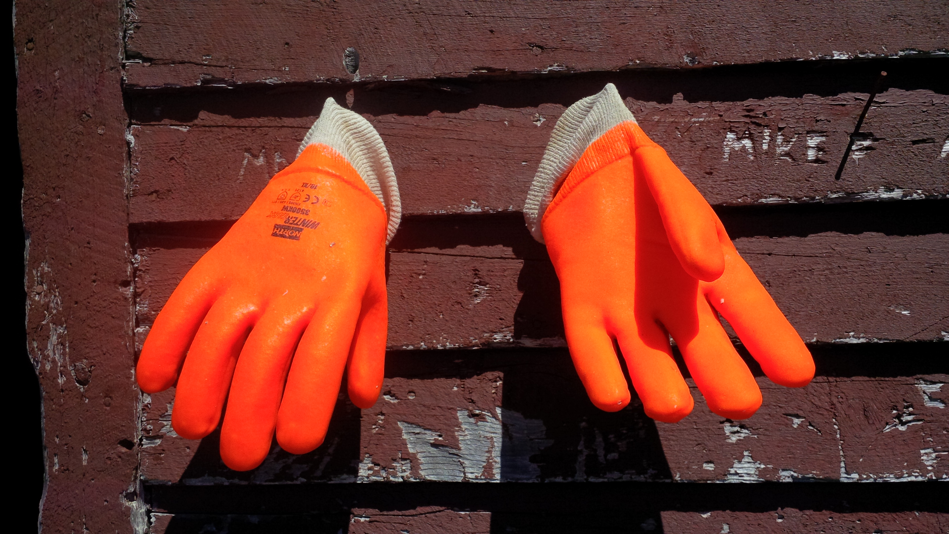 Wild guess … but I’m guessing these belong to Mike 🙂 … Smiling to think of the time it took to carve the name in the wood siding just to make that clear, rather than just tuck those gloves inside. Neon orange, no less, just so you’re not likely to miss them on the way by. Too cute!