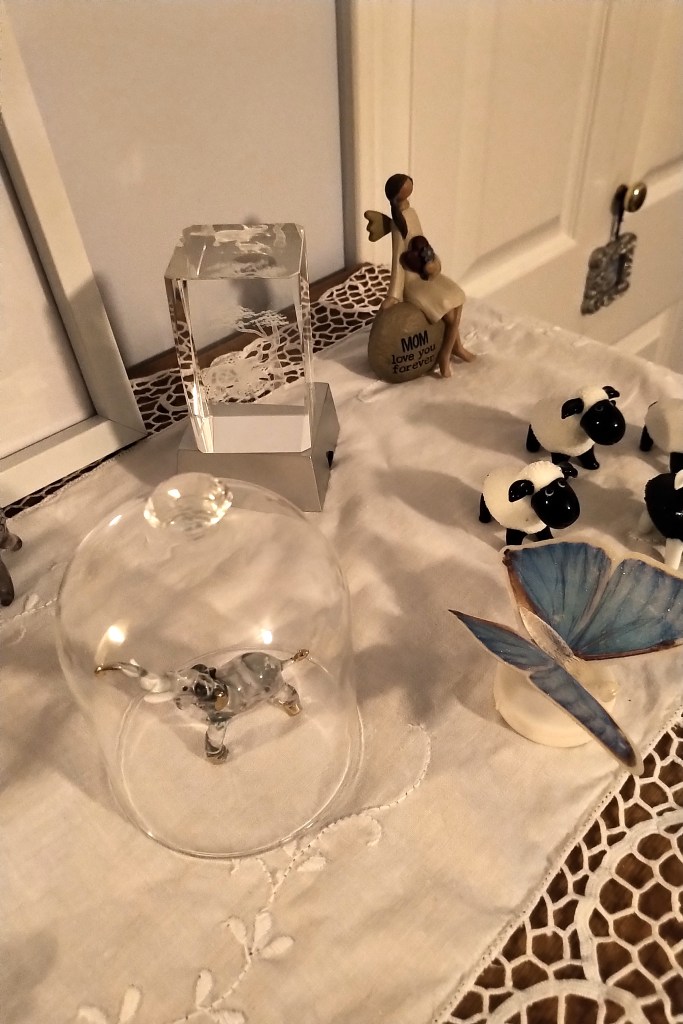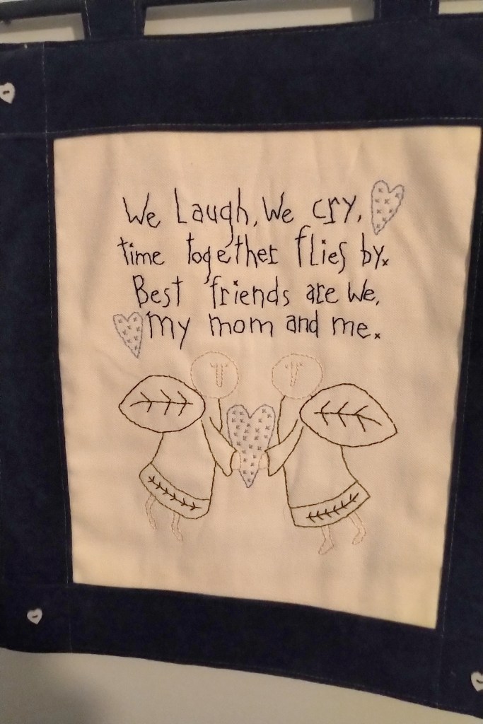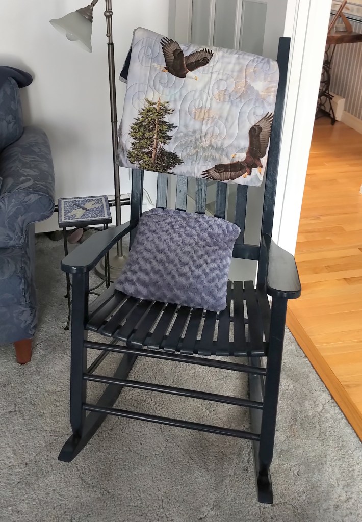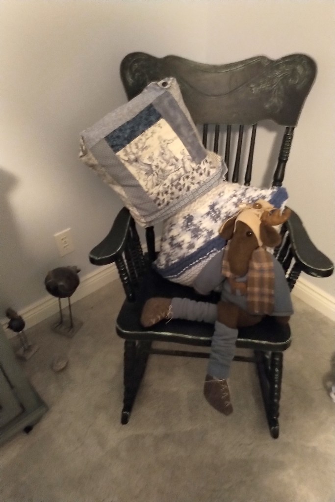 I loved to add elements to Mom’s white and blue room, a treasured bottle, a pewter knick-knack, an embroidered quote. She always loved to retire to it at night early to spend some time reading and enjoying before sleep enveloped her, and she loved to wake up in the morning to the sun shining in. The antique rocker was a rare find in a lovely shop – the owner wasn’t sure it was for sale, but I managed to secure it – such a wonderful addition to my home!
