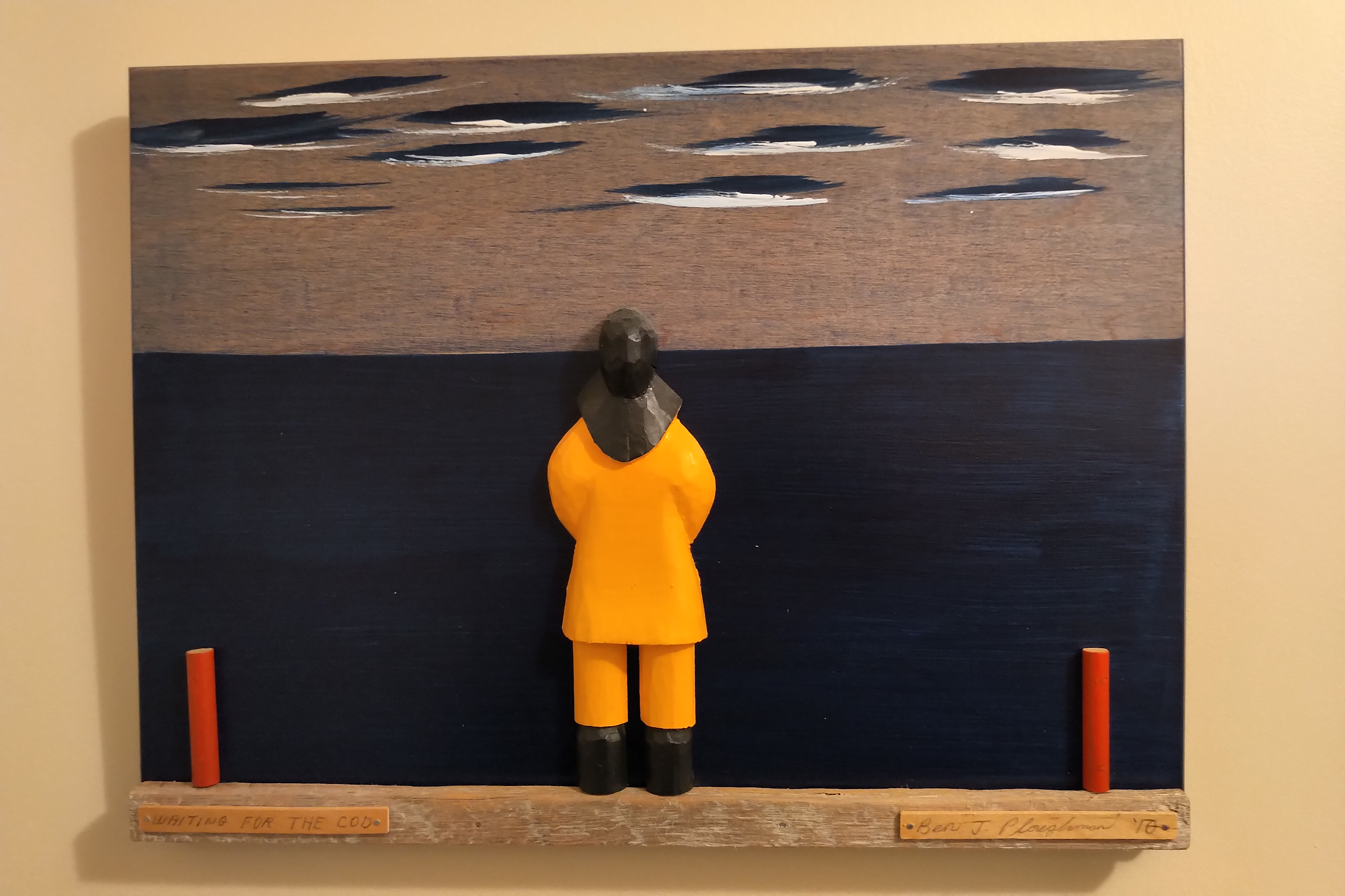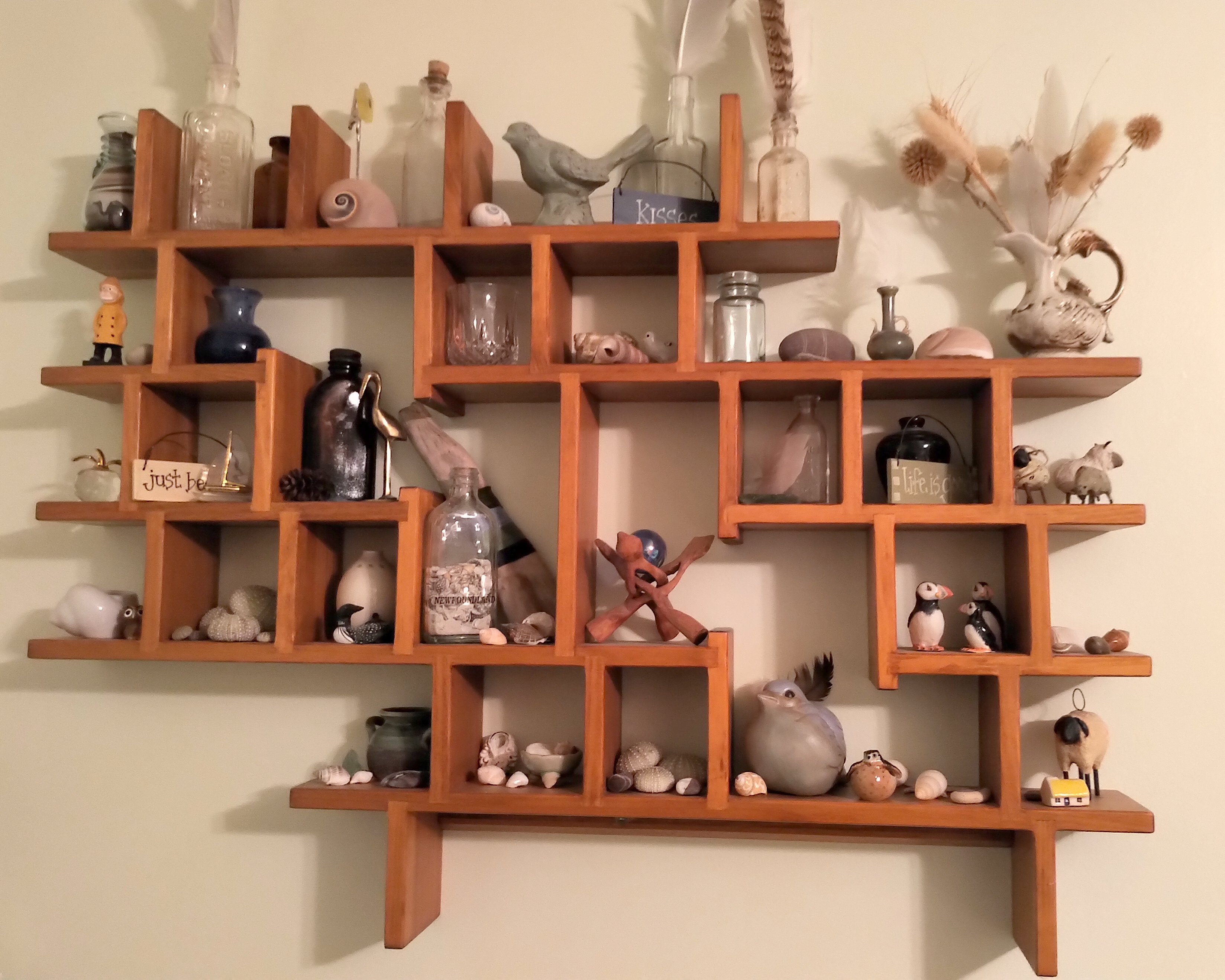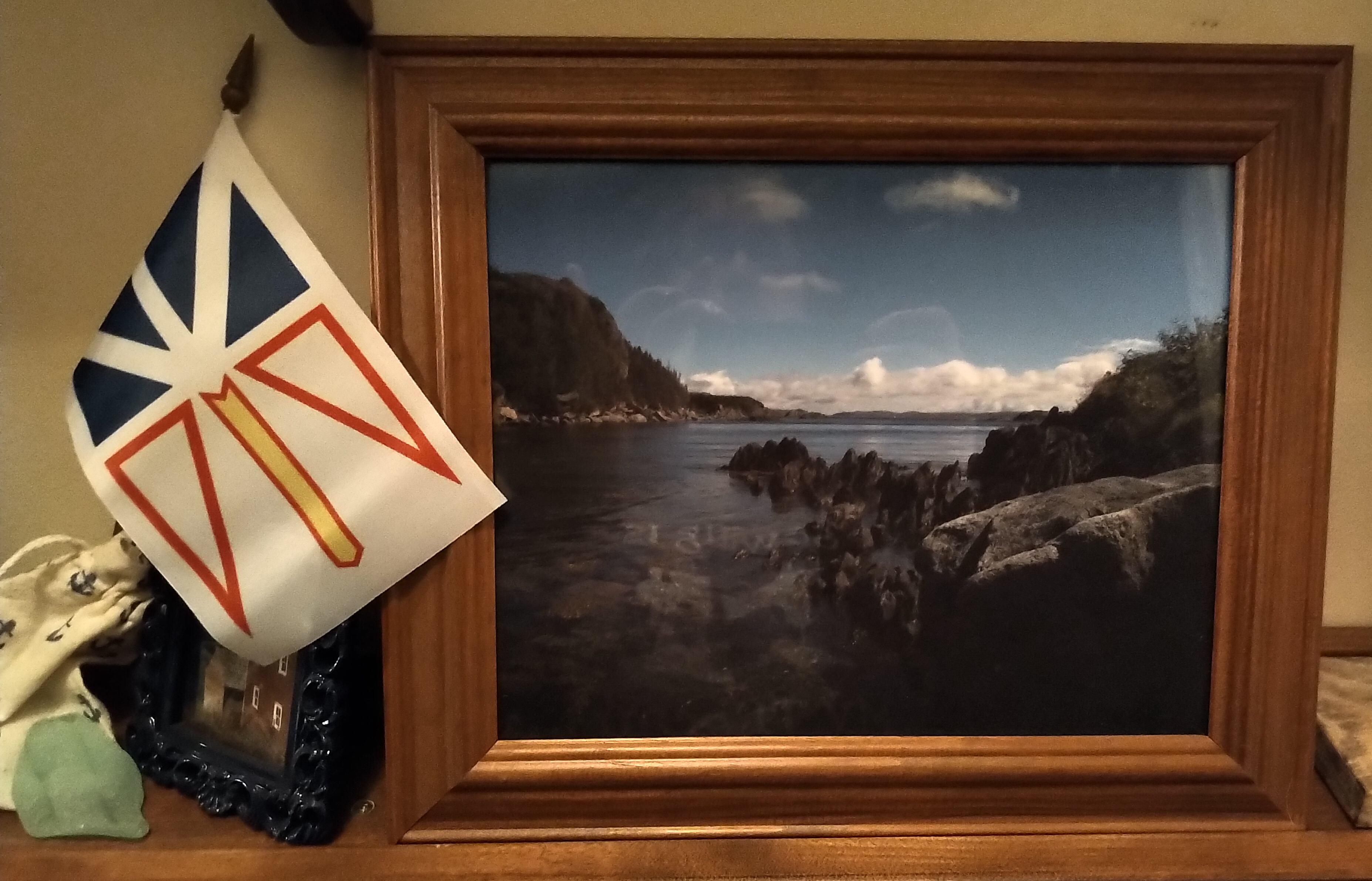 There’s not much wall space still vacant … lots of photographs/trinkets on my gallery wall, the beautiful shelving done by a local carpenter who built the kitchen cabinetry in this home long before I owned it. I am a proud owner of the delightful folk art of Ben Ploughman (his studio in Port au Choix is an awesome place to visit and you’ll leave not only with his art but a good old Newfoundland tale or two from the owner). A brass bird picture reminds me of my beloved maternal grandma who did a number of these pieces – always busy with her hands – guess she passed that on to my dear Mom, and me! I’m also enchanted with Chris Rickett’s paintings – Chris is from King’s Cove and owns the amazing Round Da Bay Inn together with his lovely wife Karen.