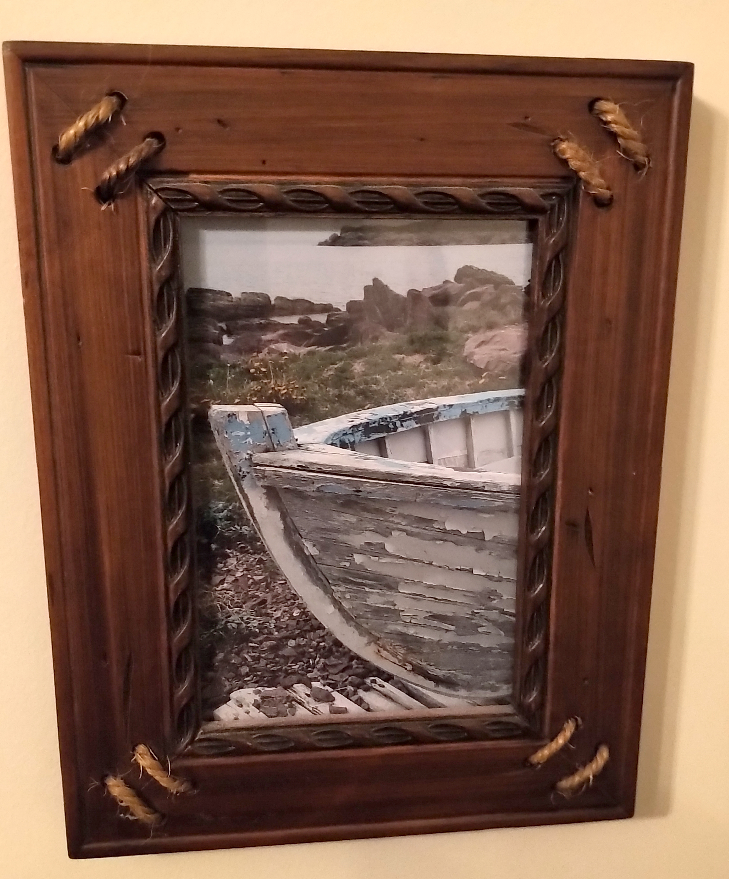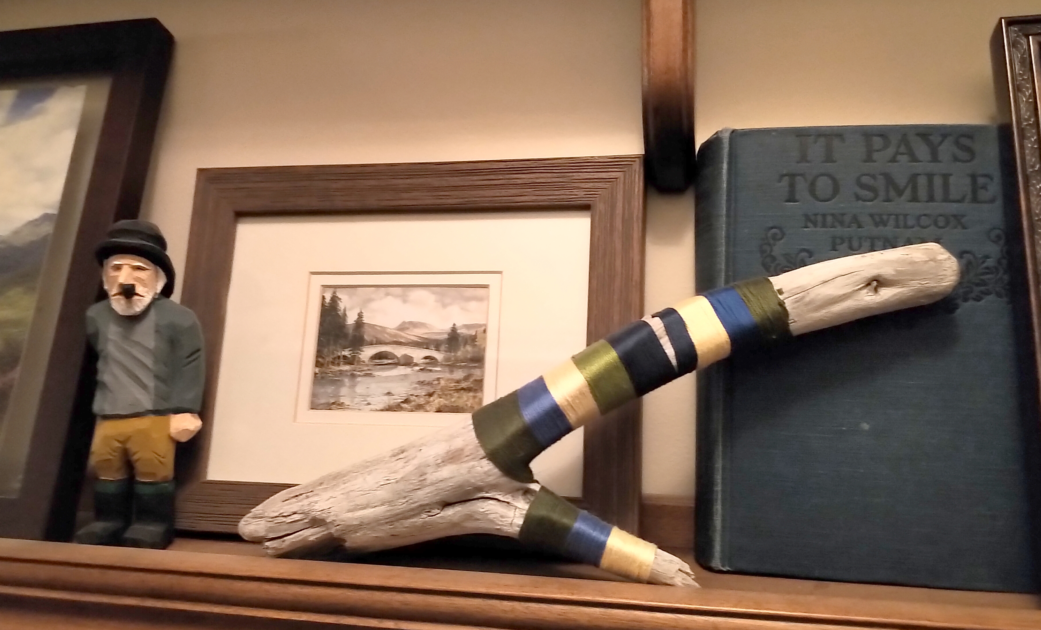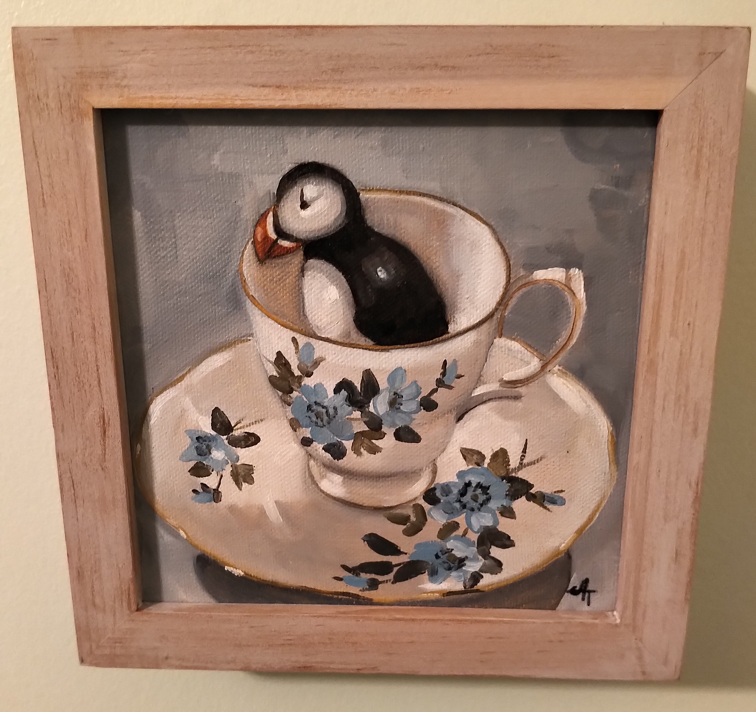 There’s not much wall space still vacant … lots of photographs/trinkets on my gallery wall, the beautiful shelving done by a local carpenter who built the kitchen cabinetry in this home long before I owned it. I am a proud owner of the delightful folk art of Ben Ploughman (his studio in Port au Choix is an awesome place to visit and you’ll leave not only with his art but a good old Newfoundland tale or two from the owner). A brass bird picture reminds me of my beloved maternal grandma who did a number of these pieces – always busy with her hands – guess she passed that on to my dear Mom, and me! I’m also enchanted with Chris Rickett’s paintings – Chris is from King’s Cove and owns the amazing Round Da Bay Inn together with his lovely wife Karen.