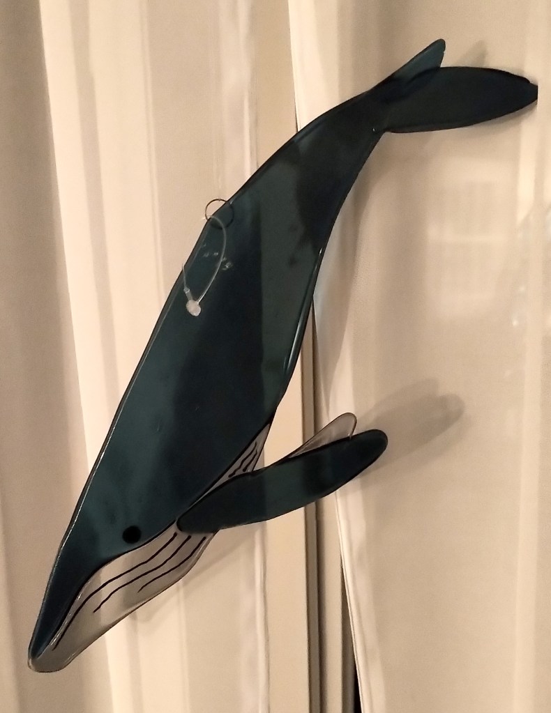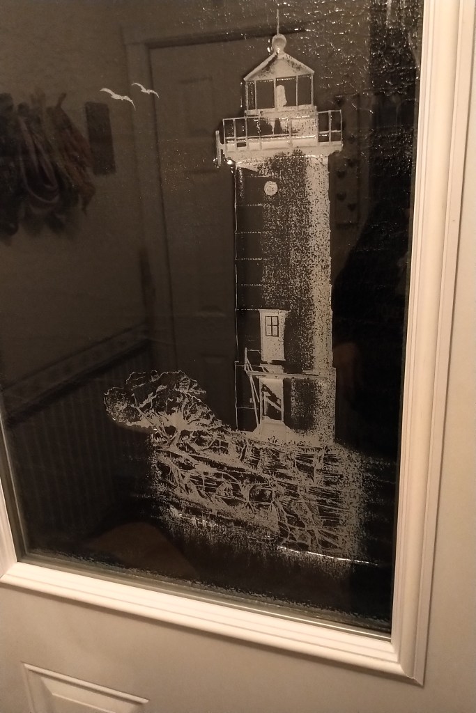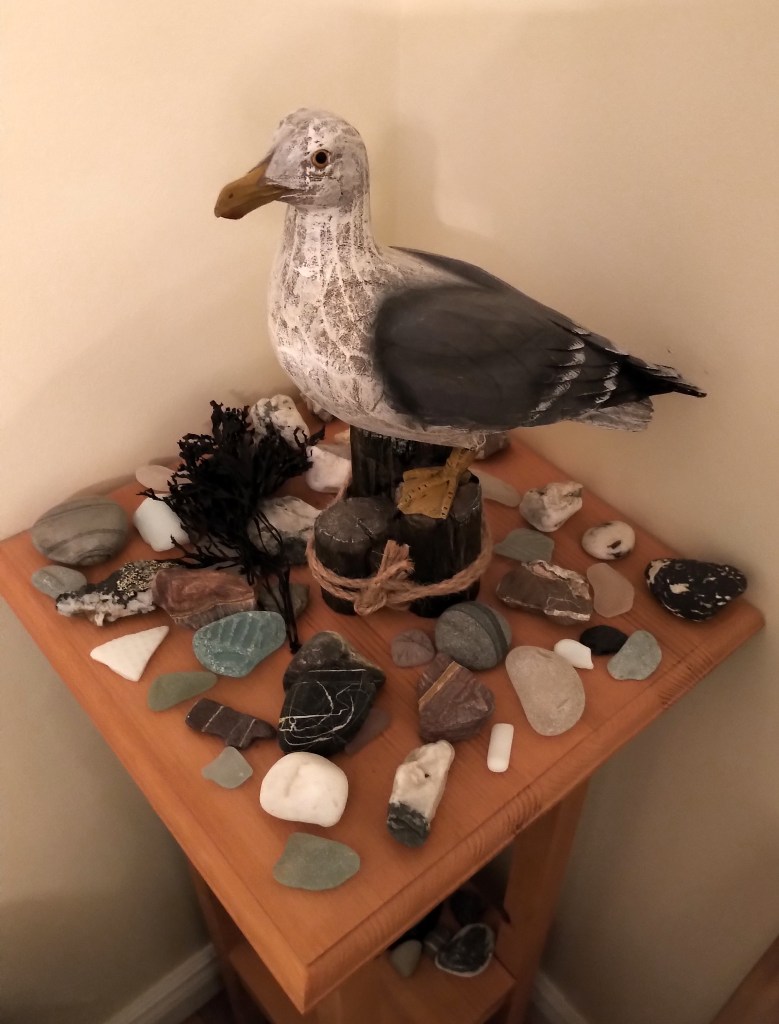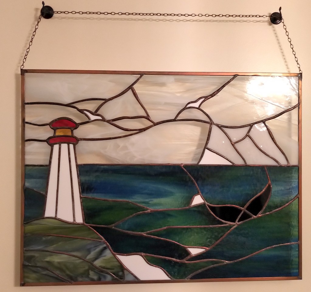 This stained glass piece was commissioned by me from a lovely glass shop in Chapel Arm, which sadly is no longer there. It depicts all my favourite things – seagulls soaring above the waves, icebergs, whale tails and of course the proverbial lighthouse.