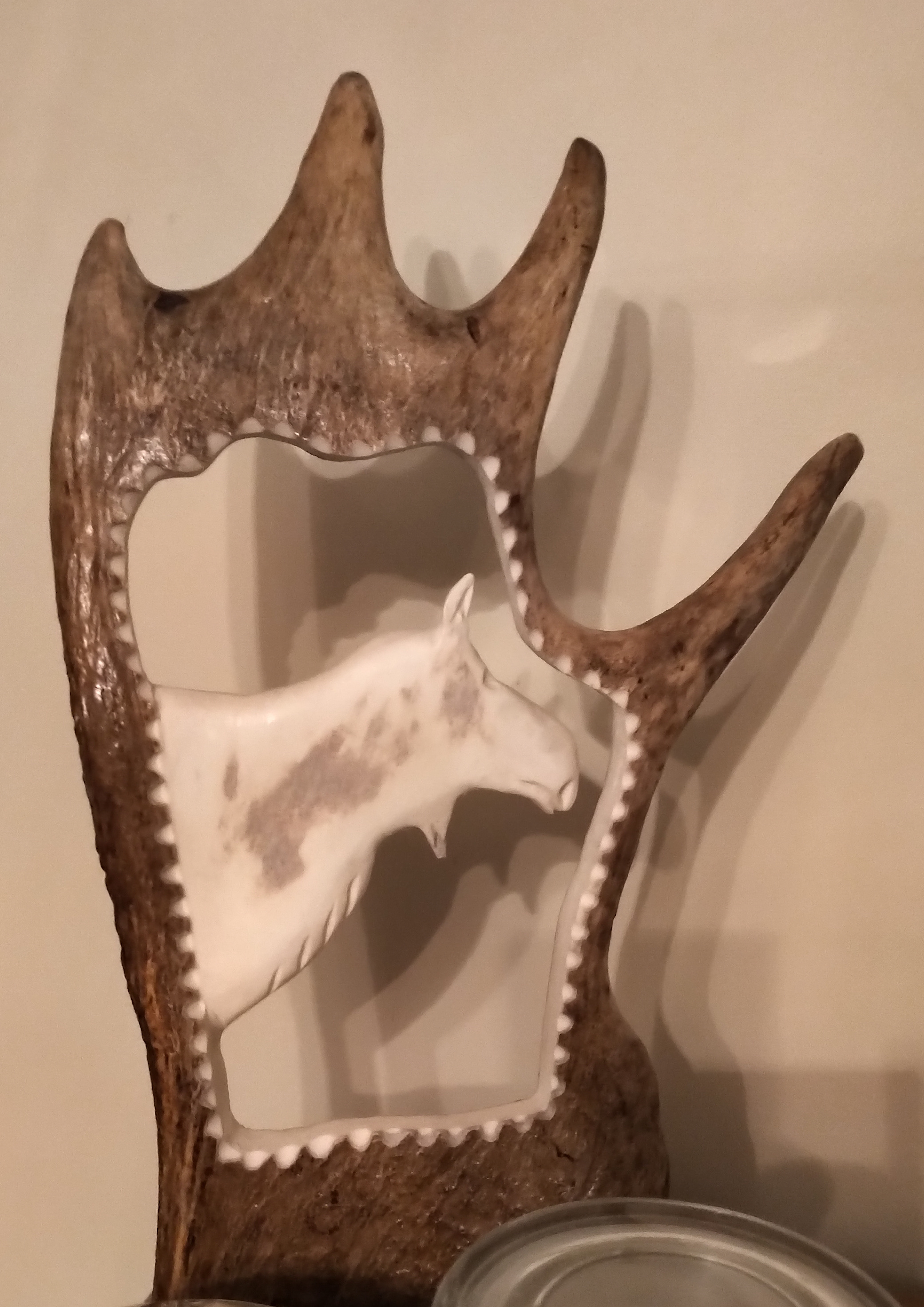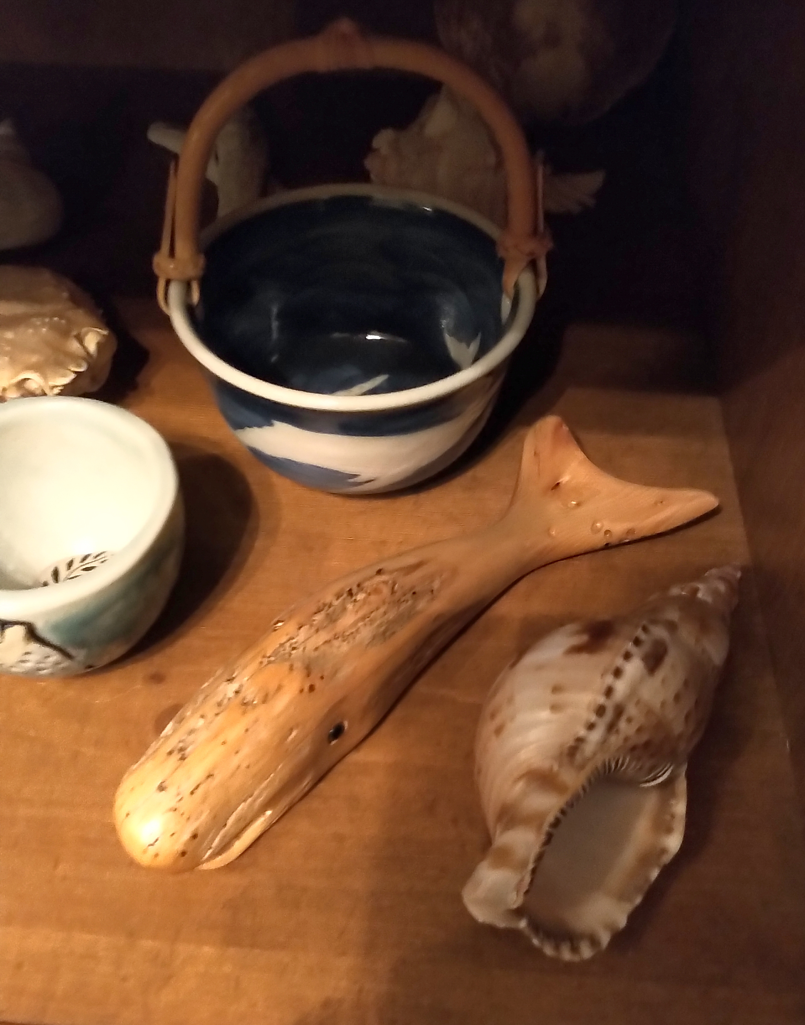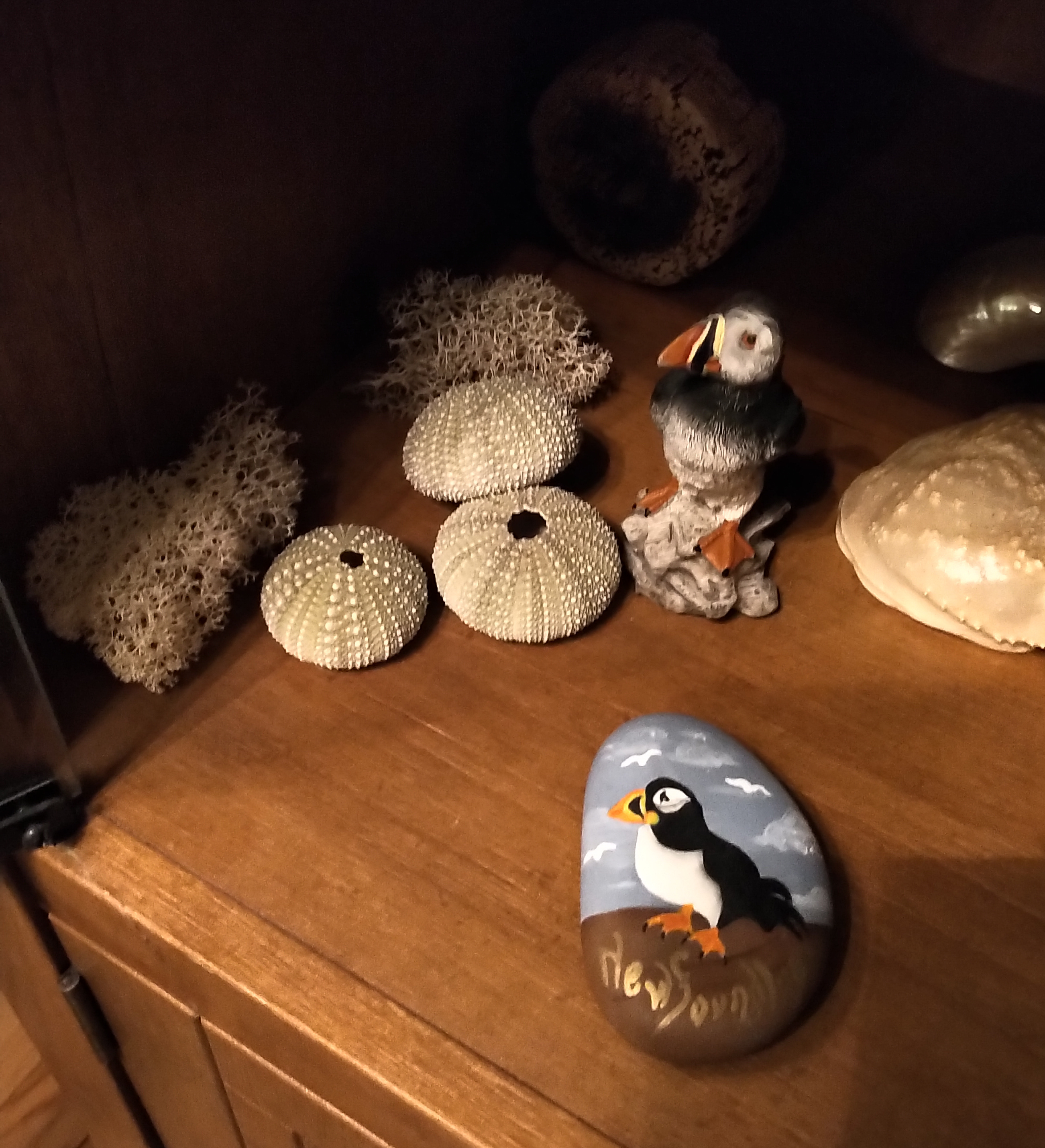 Pull up a chair in the family room, it’s bountifully filled with treasures depicting puffins, whales, shells, moose, boats, port-hole clock (not that we track time time here!), antler and whale-bone carvings, lighthouses, saltbox houses, caribou, and all things wild and charming…. complete with my dear father’s binoculars in their old leather case – I well remember him using these on our Algonquin trips, and now I can use them to scan the coast – he would have loved to use them here as well. It is also very special to have my dear friend Graham’s painting on the wall (one of a few I have), depicting an old shelter in nearby Jamestown which is no longer there. Sadly, Graham’s eyesight is also gone so the value of the painting is intensely increased for me.