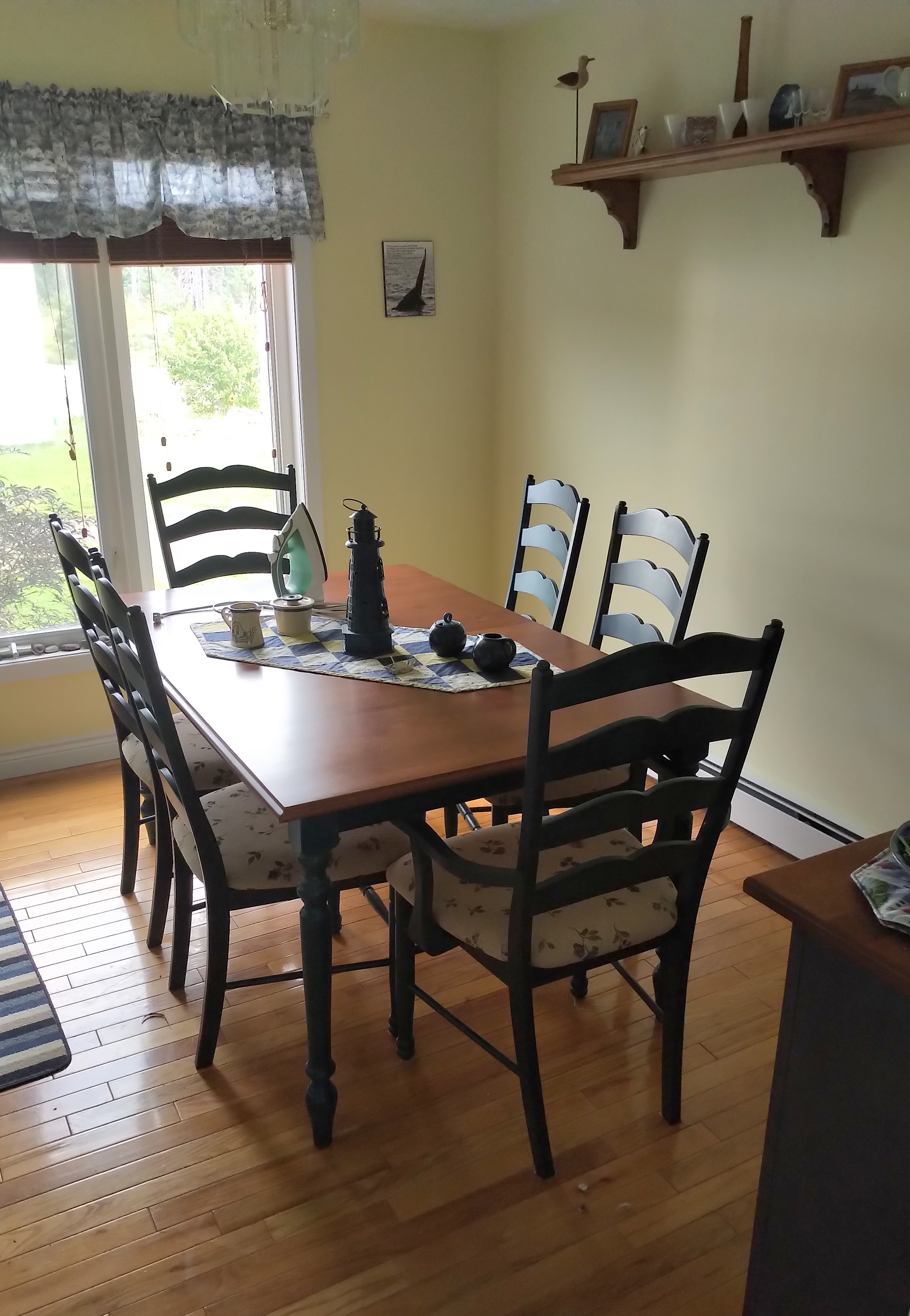 The living room is also blue and white, with many books to choose from, wonderful dimmer lighting, and comfy furniture for a nap or a read. The dolphin box I managed to buy from Creative World in Clarenville at half-price, and stores all manner of maps, hiking books and tourist info for the wanna-be wanderer…