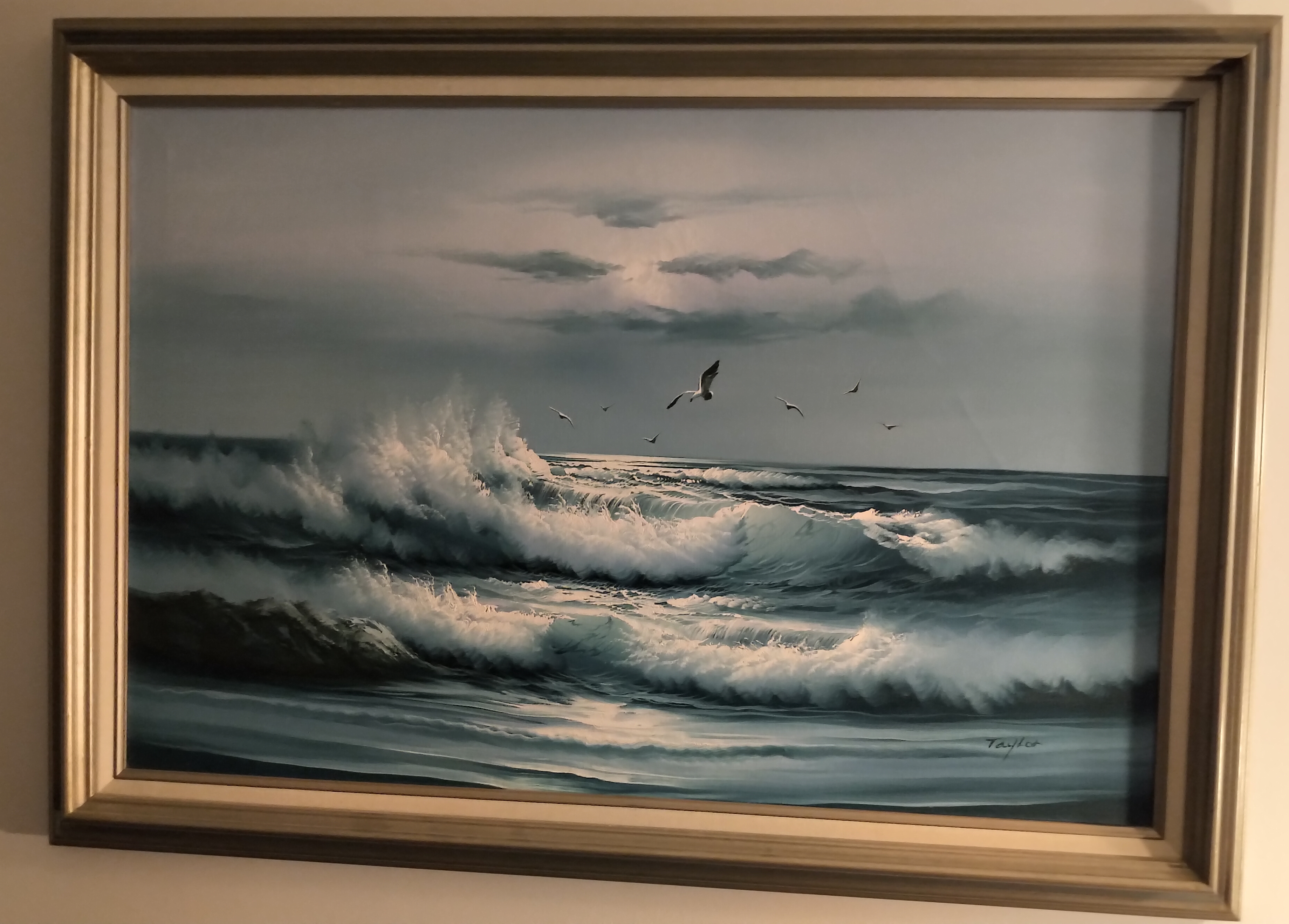 This stained glass piece was commissioned by me from a lovely glass shop in Chapel Arm, which sadly is no longer there. It depicts all my favourite things – seagulls soaring above the waves, icebergs, whale tails and of course the proverbial lighthouse.